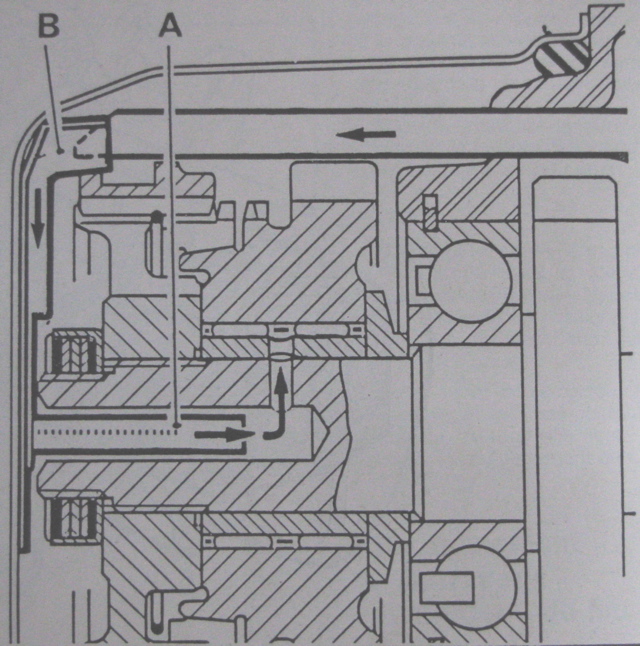 Ci-dessous, le circuit de circulation de l'huile, qui est réinjectée dans le canal de l'arbre :