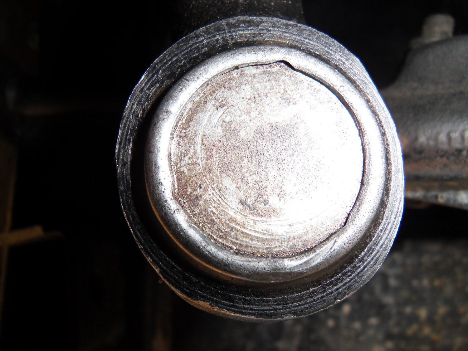 je mets une tige filetée M12, une grosse douille de 32 en bas, et je commence a visser... P'tain, l'est bien coincé la garce de coupelle! et ce qui devait arriver... grand 'paf', des morceaux par terre... mais pas de coupelle! la tige filetée a pété net!