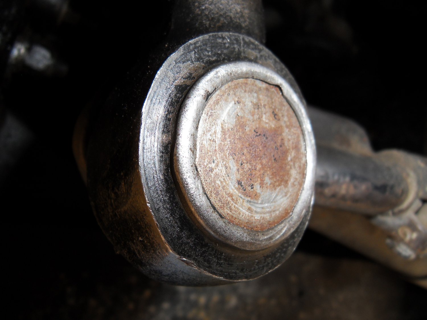 je mets une tige filetée M12, une grosse douille de 32 en bas, et je commence a visser... P'tain, l'est bien coincé la garce de coupelle! et ce qui devait arriver... grand 'paf', des morceaux par terre... mais pas de coupelle! la tige filetée a pété net!