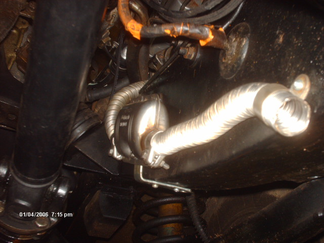 pose de la pompe je l'ai fixée sur le châssis avec un gros rylsan et entourée de mousse pour éviter la transmission du bruit. On en profite pour une vue de l'échappement, j'ai percé le châssis pour le fixer (attention à retenir le foret car le faisceau électrique passe dans le longeron) j'ai fait avec les bouts de tuyau que j'avais si la fumée remonte dans l'habitacle on verra plus tard. Reste à faire le le circuit d'eau, là je me pose des questions le sens de la circulation de l'eau serait (en touchant la durite la plus rapidement chaude) la durite sortant de la culasse (donc celle à couper pour ponter la chaudière?).