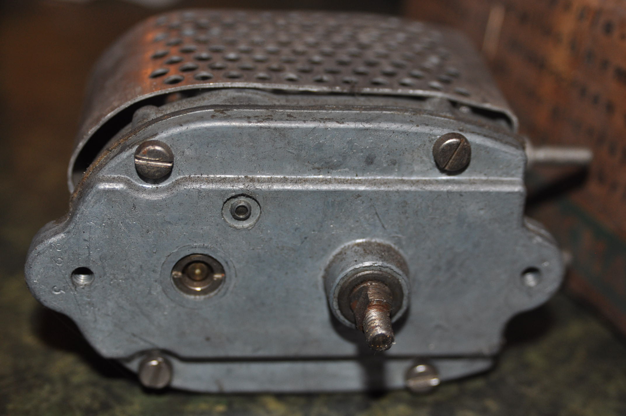 Un en 6V: broche rouge le +6V; la verte le + après contact pour le fin de course; la masse = la carcasse; branchements vissés. Axe de sortie. Aspect du capot. Il a l'air neuf, je l'ai testé, il fallait que je le secoue pour qu'il tourne et de temps en temps il s'arrête. Je l'ai ouvert pour voir, la graisse à l’intérieur est sèche. La fonction fin de course est opérationnelle. En 12V, même branchement sauf que là ce sont des cosses rondes, axe de sortie différent du de celui du 6V; moteur testé OK, neuf? Mais propre. Les deux cote à cote pour comparaison: La technologie de mise en contact des charbons est particulièrement intéressante... Bon OK j’arrête là pour revenir sur terre