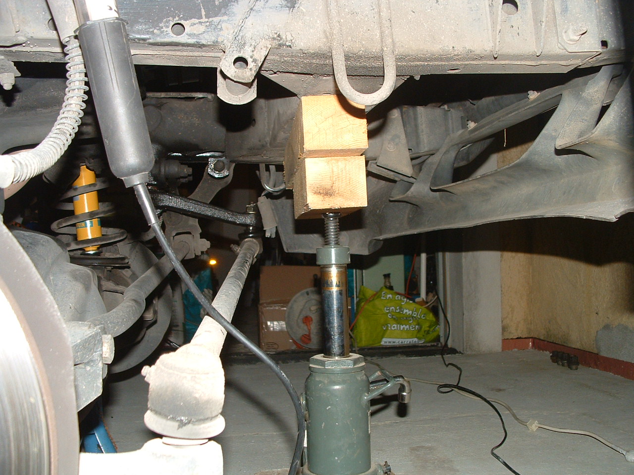 J'ai commencé par l'avant pensant que ce serait le plus compliqué. J'avais tort, tout s'est bien passé. J'ai juste soulevé le véhicule sous un longeron pour détendre le plus possible les suspensions et ne pas avoir trop de mal à redescendre les tourelles, car les Koni "Heavy track" sont vraiment très durs à comprimer.