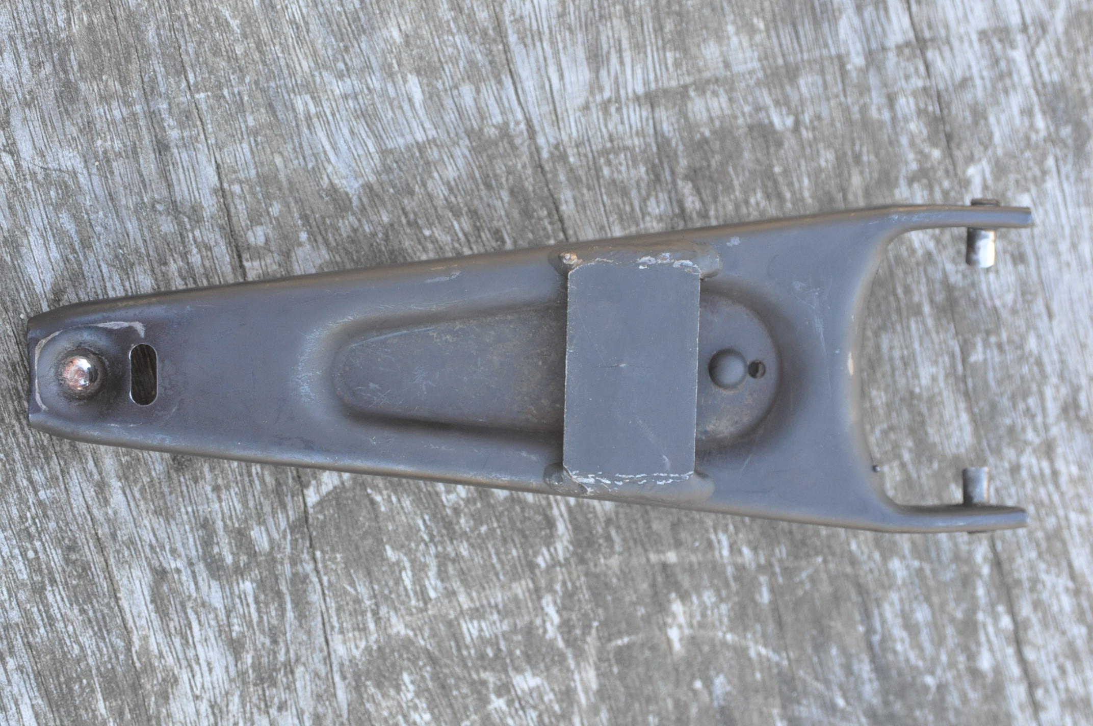 Le but étant d'éviter ça: On se dit, je vais acheter ça tout fait chez machin, ce n'est pas tellement plus chère: Mais voilà, en y regardant de plus près après 20000km: En regardant bien sur la première photo on peut voir que la plaque de renfort commençait déjà a se fendre: Voilà que le vilain phénomène se produit quand même: Mais attention, c'est le nez au milieu de la figure, car il n'y a pas que ça. Sur une fourchette d'origine renforcée en place, avec la butée qu'elle commande: On voit que les efforts se transmettent aux deux extrémités: