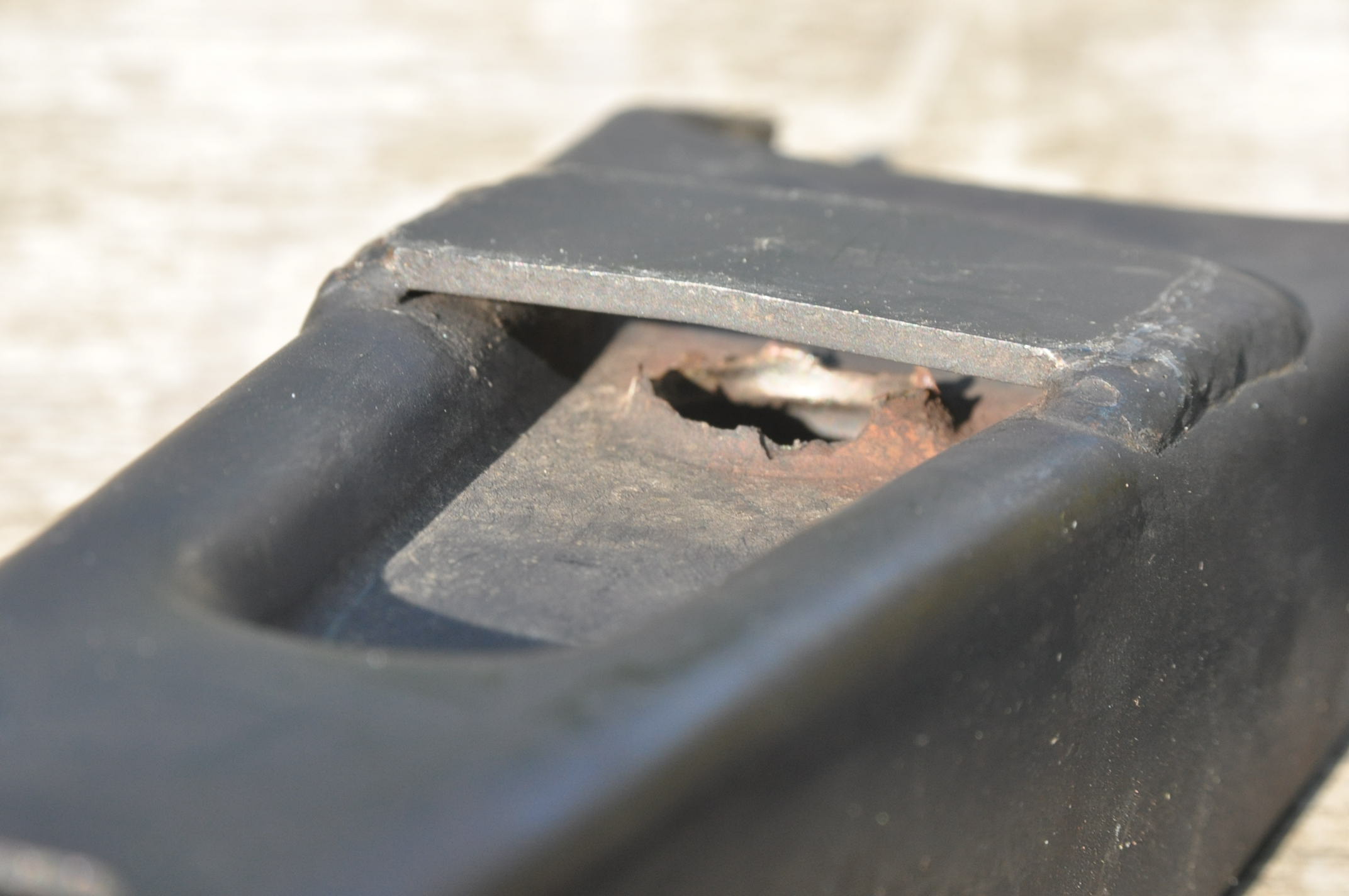 On peut, bien sur, renforcer avec une grosse rondelle soudée ou un bout de fer plat: Mais au démontage, je préféré bien regarder l'état d'usure d'une fourchette d'origine, éventuellement la renforcée, plutôt que de monter une fourchette adaptable même vendue renforcée d'origine, car l'acier est moins bon, le sertissage des petits axes des galets de commande de butée est moins bon... Et tout ça sont des détails qui ne sautent pas aux yeux lors de l'achat.