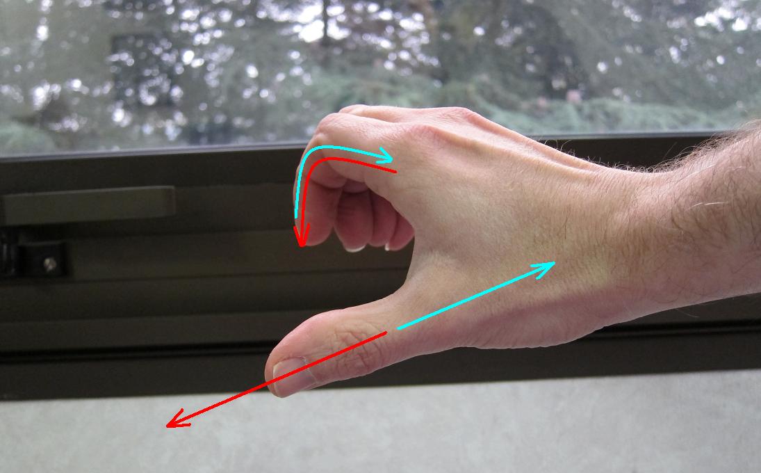 Mon pouce indique le sens de déplacement de la partie qui tourne, mes doigts, positionnés comme si je tenais un tournevis, indique le sens de rotation. Si je tourne ma main selon mes doigts, ma main se déplace vers le coté pouce. Pour le pas à droite, j'utilise ma main droite. Pour le pas à gauche, j'utilise ma main gauche.