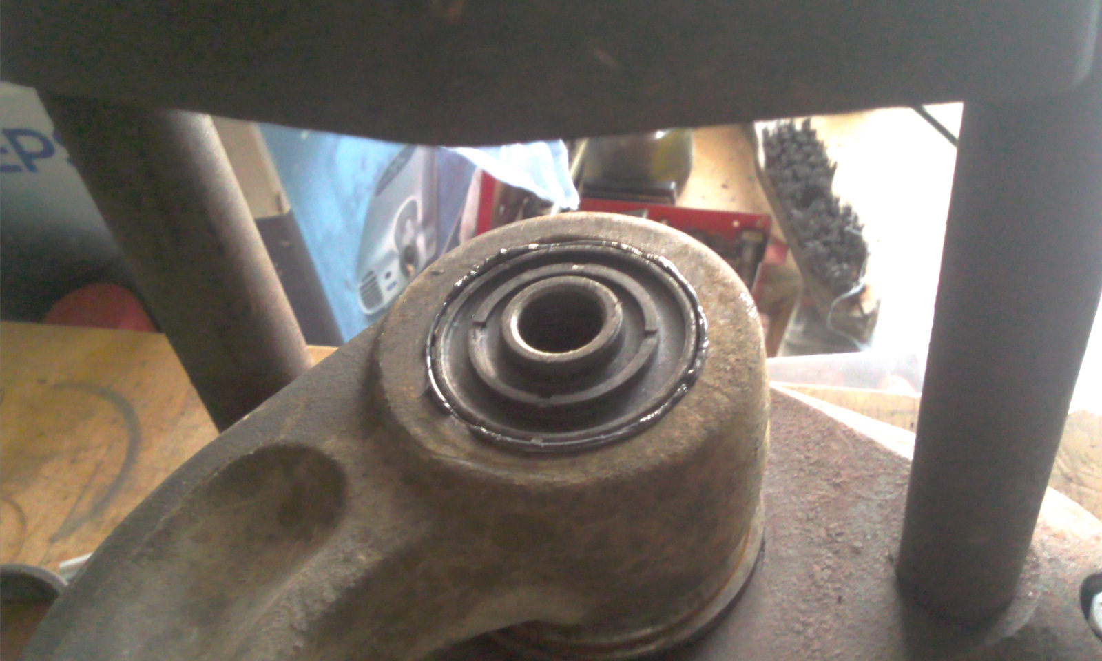 Dans ce genre de montage, le jeu théorique ne doit pas dépasser 1/10 mm, l'idéal étant le coulissement gras (2/3 centièmes). Avec les jeux que tu as relevés, la force de serrage ne parviendra pas à reprendre les efforts radiaux dominants (freinage, effort de traction, chacun dans un sens différent, of course) qui sont évidemment perpendiculaires à la vis et beaucoup plus importants que ceux générés par les efforts de torsion passant dans l'élastomère.