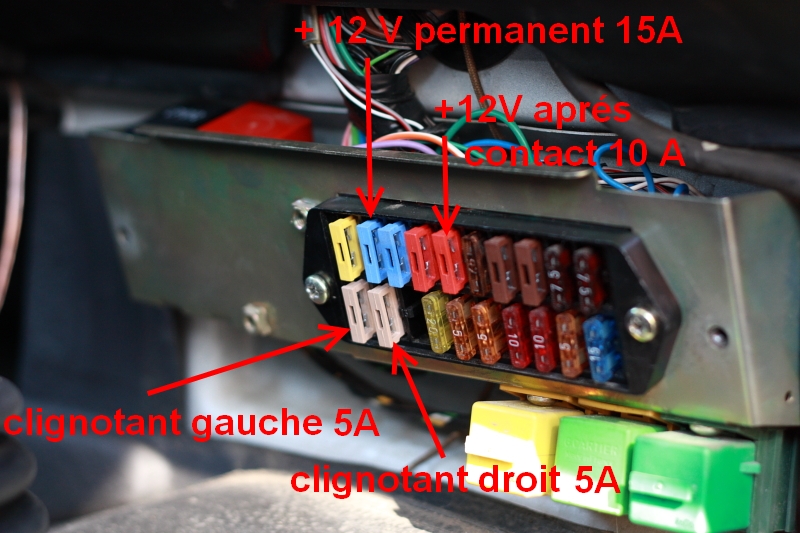 Tes fusibles sont bons, mais il faudrait que tu contrôles que leurs valeurs en Ampère correspondent bien aux valeurs indiquées sur le couvercle d'une part ( OK d’après ta photo), et d'autre part que tu regardes si ils n'ont pas une salle gueule, dans le sens plastique légèrement fondu enlève les pour ça, pas un simple contrôle visuel en place; si c'est le cas changes les au moindre doute. Les deux des ampoule en sortie G et D eux n'ont rien, leur seul défaut c'est de ne pas être d'origine, mais ce n'est pas grave, mais il faut contrôler celui du +12V permanent et celui du +12v après contact qui concerne les clignotants. Si tu as un doute sur le quel est-ce, tu mets en route les clignotant et tu enlève le fusible, tu verras bien celui qui arrêtera les clignotants quand tu l'enlèves. Même manipulation avec le + 12V permanent mais sans le contact cette fois. Sois sûr de leur état, la suite te fera comprendre pourquoi cette précaution.par contre je ne sais pas comment contrôler les fusibles de clignotants.