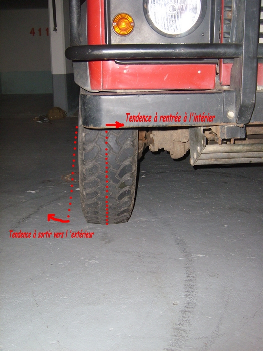 Et là je m’aperçois que ma roue droite à une tendance en haut du pneu à rentrée vers l'intérieur ; donc le bas du pneu à sortir vers l'extérieur