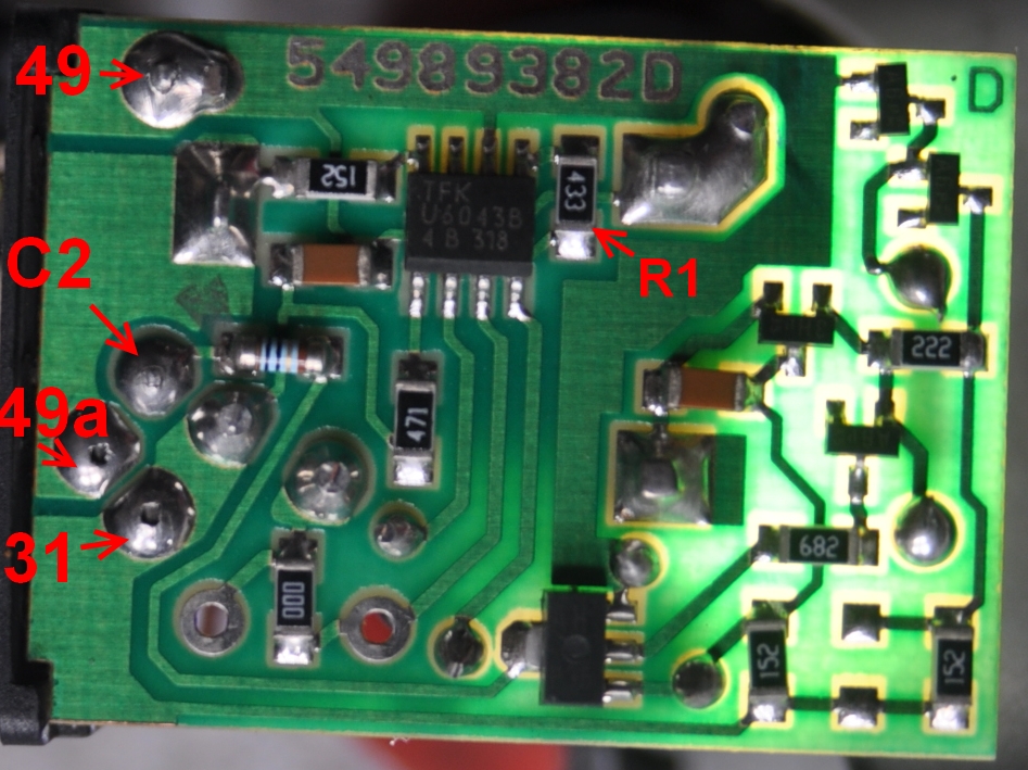 5) La soudure de la connexion 49 aussi est HS, c'est par là qu'arrive l'alimentation via le bouton de warning, par le fil vert clair.