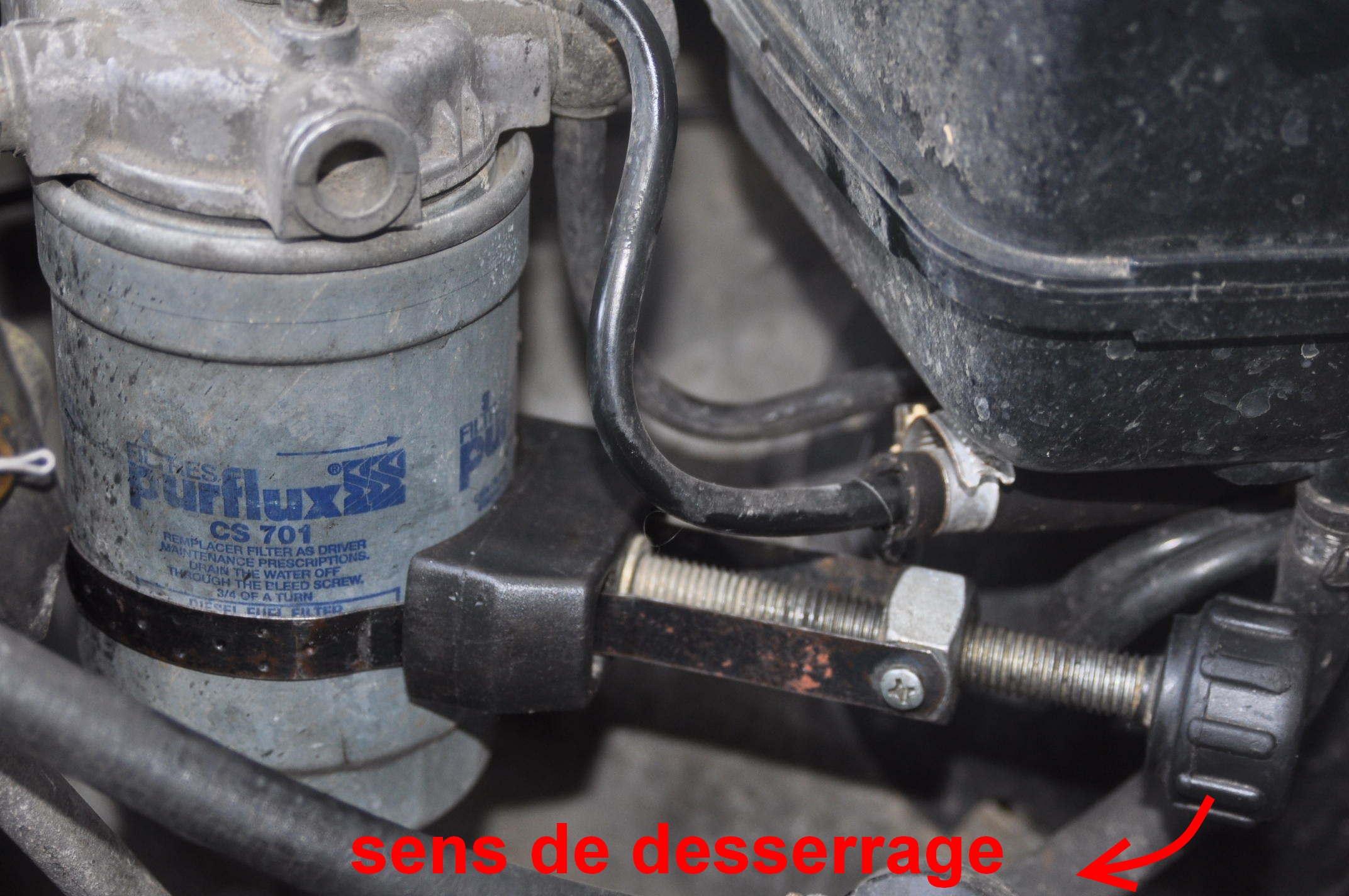 Là, c'est tout sec encore: Là ça dégueule, sans bulle. Donc il suffit de resserrer la vis de purge pas trop fort, il y a un joint cuivre. De même que le filtre a gasoil n'a besoin d'être serré trop fort.