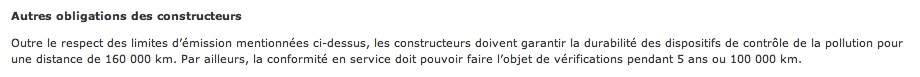 - Les constructeurs ont l'obligation de garantir leurs dispositifs de contrôle de ces émissions pour au moins 160.000kms.