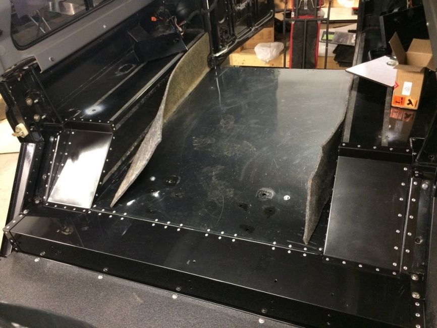 Démontage du plancher arrière en meulant les têtes des rivets métallique et en perçant au diamètre 7 les points de soudures. L’enlèvement du plancher fait apparaitre les années de poussières. Après un bon nettoyage, il s’avère aussi nécessaire de profiter de l’opération pour traiter la rouille et passer un coup de peinture châssis. J’ai éliminé la rouille à l’acide phosphorique (procuré chez Restom), cela fonctionne très bien et met la tôle à nue avant peinture. Avant : Pendant : Après : Après peinture : Mise en place des supports arrière en installant des inserts acier M8 dans la traverse du châssis. Mise en place de la nouvelle traverse de fixation des points avant de la banquette. Cette étape a nécessité plusieurs montages a blanc afin de bien ajuster la position de la banquette. J’ai profité de l’opération pour passer proprement l’alimentation 12v de mon frigo situé à l’arrière droit de la benne. Et venu ensuite le travail le plus délicat : la découpe des passages de roue car le siège du TD4 ne passe pas avec les passages de roues du TD5. J’ai donc constitué des petits caissons en tôles et équerre en aluminium assemblées par rivets pop, après réalisation d’un patron en carton. Je n’avais pas les butées de la banquette TD4, j’ai donc modifié celles du TD5. Le planché arrière a été refixé en mettant des inserts alu M5 à l’emplacement des anciens points de soudure et en le visant avec des vis BTR M5. Apprêt et peinture