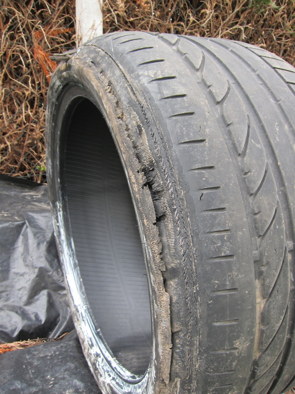 Ensuite, le flanc déchiré vient du fait que le conducteur a du continuer à rouler avec les pneus qui commençait à perdre leur pression.