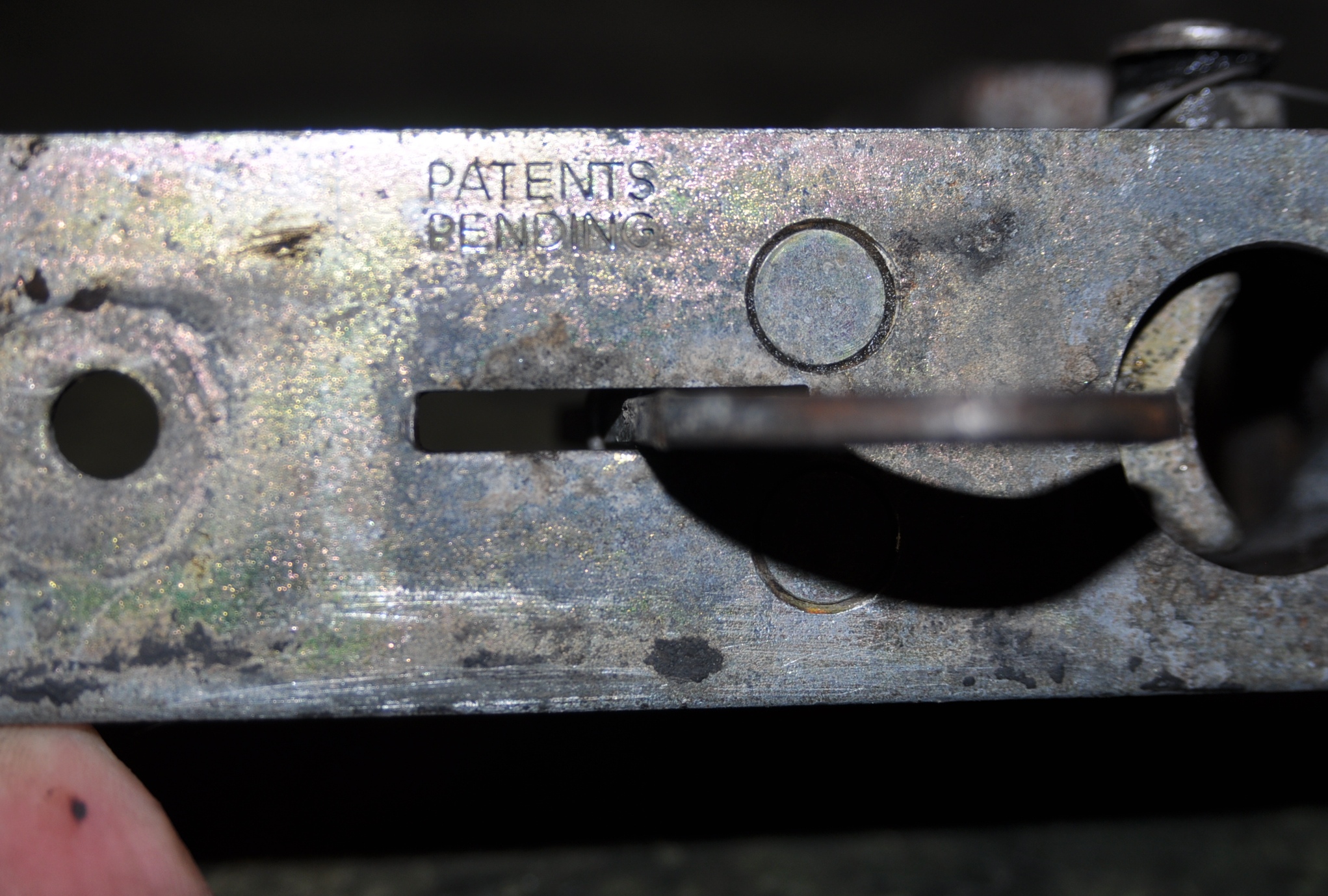 Étant donnée que la bague de la charnière droite s'est cassée et/ou était perdue le doigt de verrouillage à prit du gauche ( A ) par rapport à l'axe verticale ( V ) d'où point d'accroche entre le bord du doigt qui sert normalement à la guillotine et le bord intérieur de la collerette repéré par les flèches vertes.
