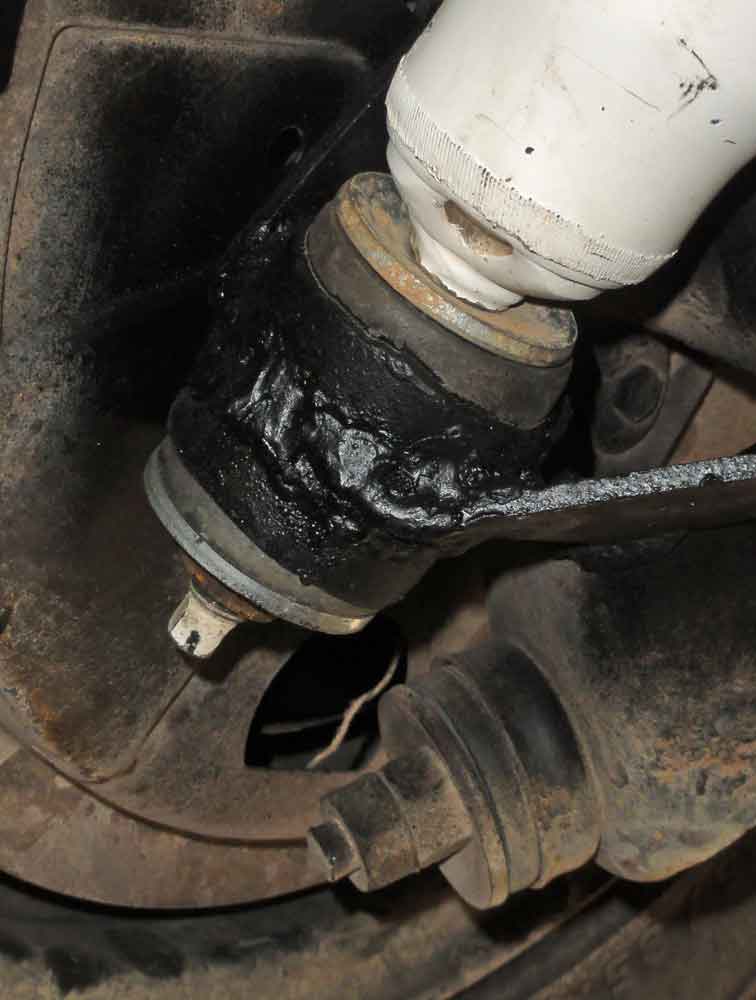 Sur la photo du bas, un bricolage temporaire où la coupelle et le silent block inférieurs sont remplacés par un polyuréthane.