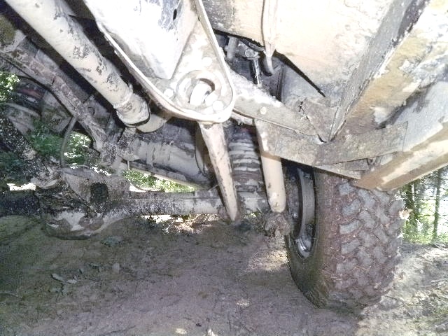 L'axe support traversant l'oeil d'amortisseur n'est ni parallèle ni perpendiculaire au pont, mais orienté au centre vers la Boite de Vitesse/ Boite de Transfert.