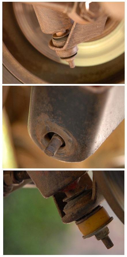 Sur la photo du bas, un bricolage temporaire où la coupelle et le silent block inférieurs sont remplacés par un polyuréthane.