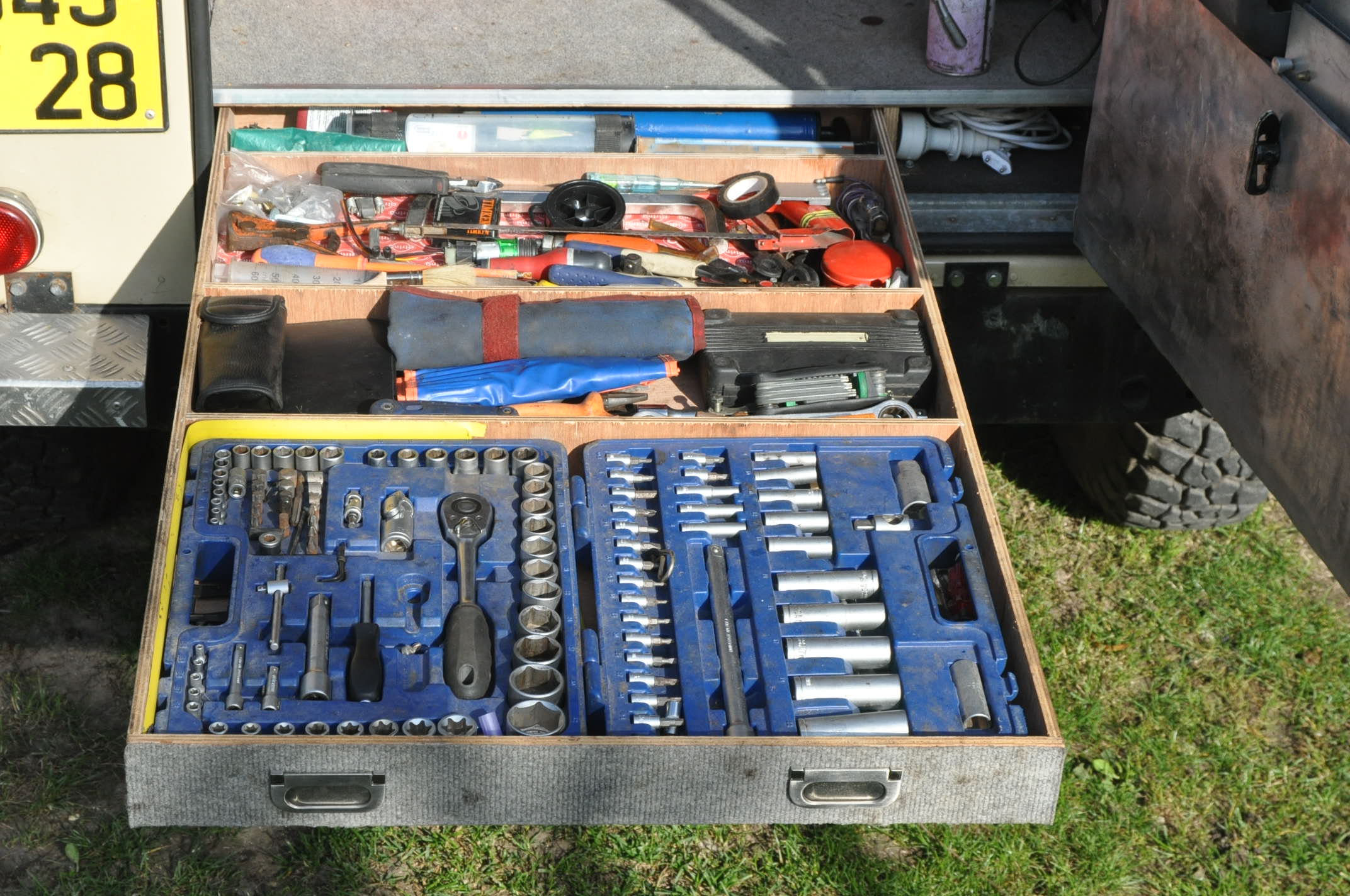 Je n'ai qu'une caisse à outils, qui se trouve dans le véhicule avec moi, ou dans mon atelier sur une table à roulettes. Ainsi, au fur et à mesure que j'ajoute des outils ou que j'en lève ceux qui ne me servent jamais, je sais qu'à tout instant, cette caisse suffit à faire tout ce que je pourrais être amené à faire, que ce soit sur la route, ou chez moi. Et comme je m'en sers régulièrement, les outils fragiles sont partis, et les outils manquants sont remplacés.