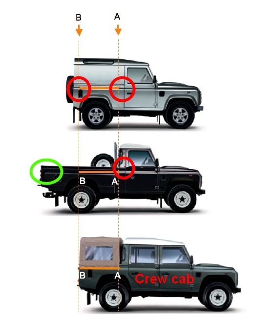 Sur ta photo, il y a un 90, un 110 HCPU et un 110 crew cab. Entre le 110 SW ou CTTE ou Crew cab et le 90 standard, c'est la longueur de baguette entre les deux soudures qui change.( le trait orange donc)