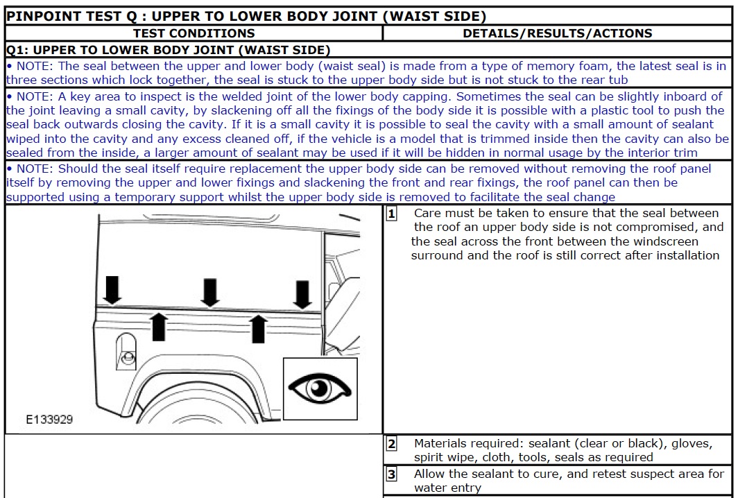 This manual should be used to find out where the water is leaking from. Due to the nature of the design and construction of the Defender this can prove to fairly difficult. The fact that water moves in seemingly random directions also adds to the problem