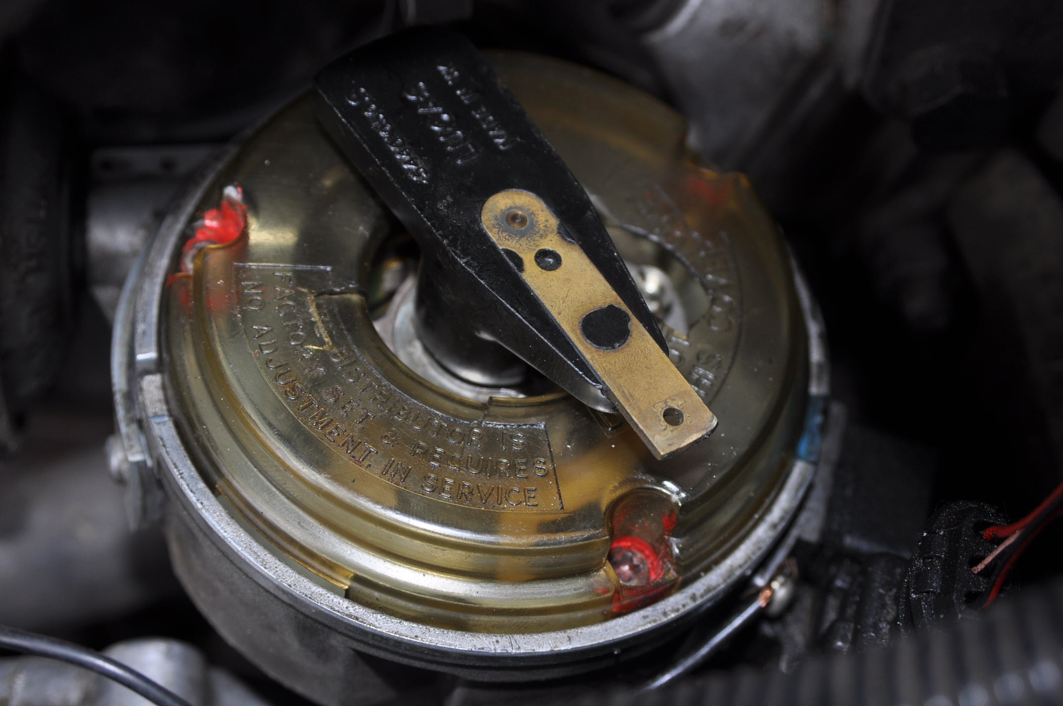 Contrôler l'état du charbon centrale, son usure et son ressort. Contrôler les plots de distribution, ce n'est pas un peu d'oxydation qui va empêcher la THT de passer. Veiller quand même a ce que cette oxydation ne parte pas en profondeur, des fois c'est trompeur, un petit grattage permet de s’affranchir de ce doute. Vérifier aussi si le plastique de la tête n'est pas fendue. sur la photo, cette tête est bonne.