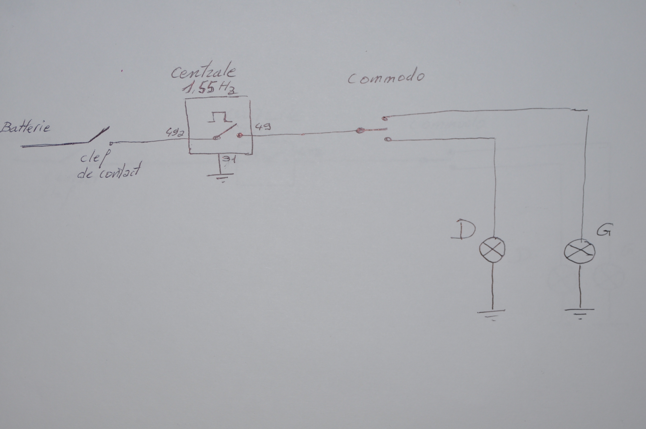 Soit un schéma simplifier d' un circuit de clignotant: Fonctionnement, après avoir mis le contact, il faut "réveiller" la centrale en positionnant le commodo soit vers la gauche soit vers la droite. Une ampoule (voir plusieurs en parallèles) ayant une très faible résistance, cela commute la borne 49 de la centrale presque à la masse et celle ci envoie par cette même borne, un 12V cadencé à 1,55 Hz c'est à dire, du 12V pendant 0,32s puis rien pendant 0,32s puis de nouveau 12V pendant 0,32s etc, tend que le commodo est d'un coté ou de l'autre.