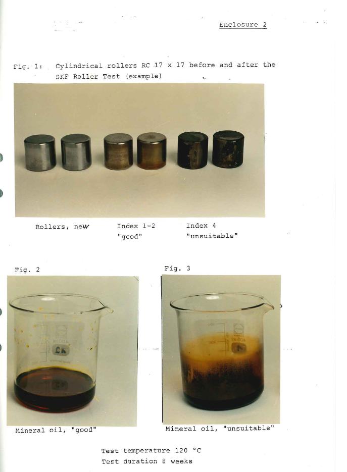 par exemple nous faisons beaucoup de test d'huile pour vérifier l'adéquation avec une application. Un des test s'appelle le SKF Roller test. On met des rouleaux dans de l'huile et hop au four. Après deux semaines, on retire deux rouleaux, puis après 4 semaines, puis après 6 et enfin 8 semaines. Entre deux huiles minérales on peut avoir des différences très importantes. Une huile sera encore bonne au bout de 8 semaines à 120°C, alors qu'une autre sera mauvaise dès les deux semaines !