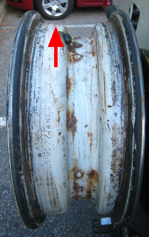 Un garage (Euromaster) m’a dit que mes jantes n’étaient pas tubeless, car elles n’ont pas de vague dans l’épaisseur (voir petite flèche).