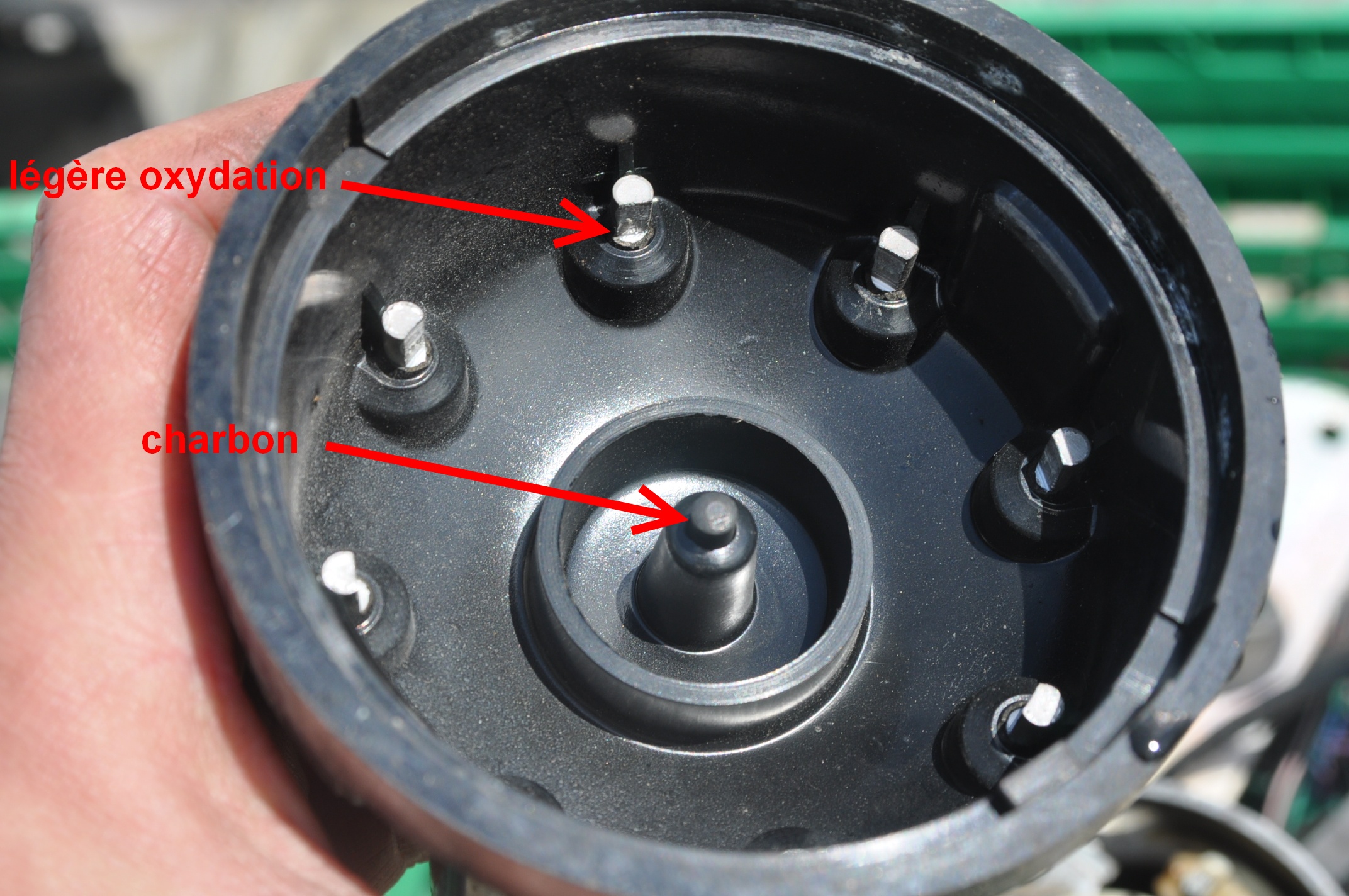 Contrôler l'état du charbon centrale, son usure et son ressort. Contrôler les plots de distribution, ce n'est pas un peu d'oxydation qui va empêcher la THT de passer. Veiller quand même a ce que cette oxydation ne parte pas en profondeur, des fois c'est trompeur, un petit grattage permet de s’affranchir de ce doute. Vérifier aussi si le plastique de la tête n'est pas fendue. sur la photo, cette tête est bonne.