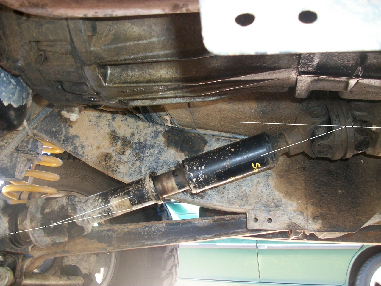4- la jonction différentiel de pont/arbre de transmission remontera du même coup vers le haut en faisant diminuer l'angle de l'arbre coté pont,