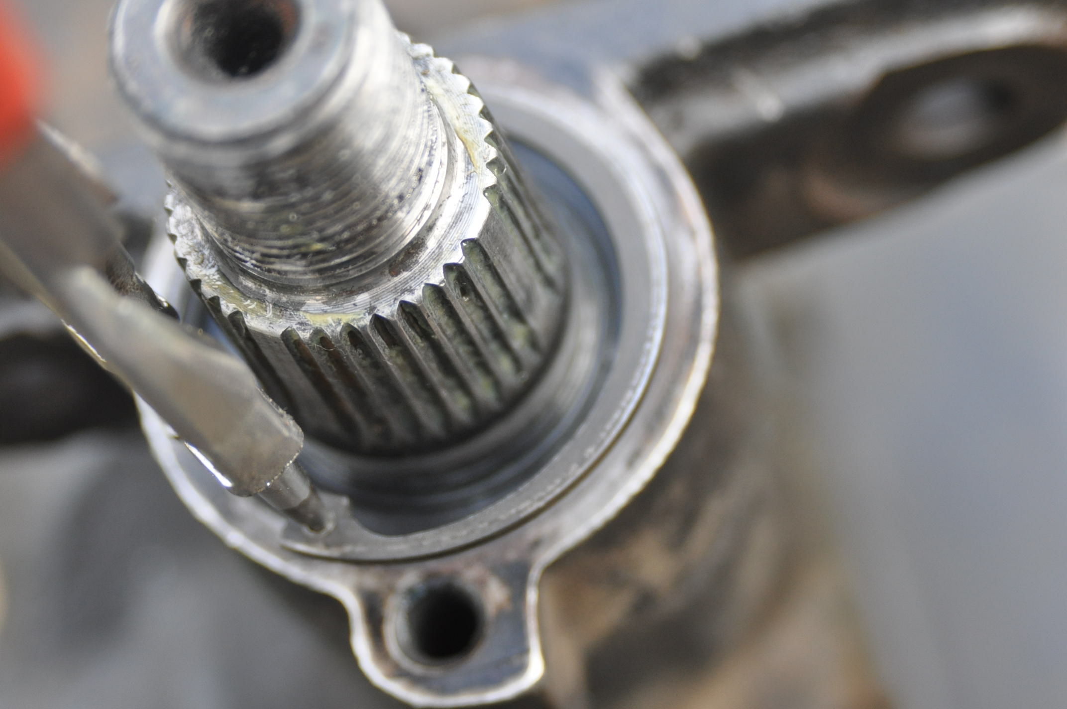 55) Un bel exemple de fuite sur le joint d'entrée. Sur ce modèle, il y a le cache poussière en place.