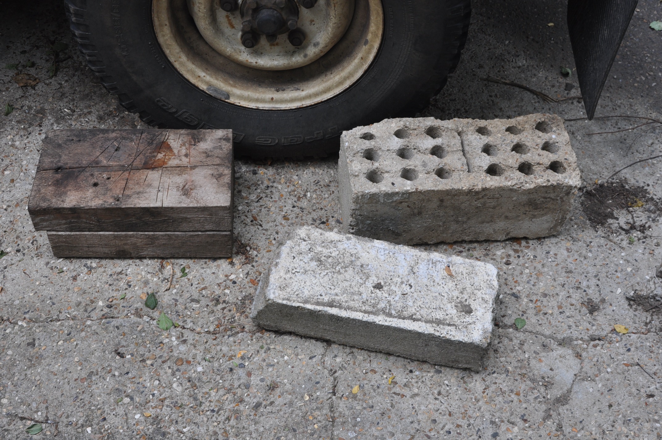 Petit parpaing plein, parpaing renforcé ou d'angle, bouts de bastaings, font très bien l'affaire et sont simple à mettre en œuvre avec un cric en levant roue après roue.