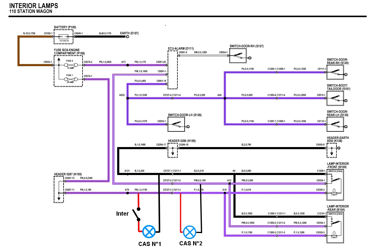 Le fil violet liseré marron est un +12V permanent. Fais attention à la couleur dominante des fils et à leurs liseré ou petit filet de couleur, ils sont important et ne sont pas toujours évident à distinguer sur les fils violets. Dans ce cas, il faut obligatoirement que ton plafonnier soit muni d'un interrupteur intégré, ou que tu en câbles un au tableau de bord sinon il serait allumé en permanence.