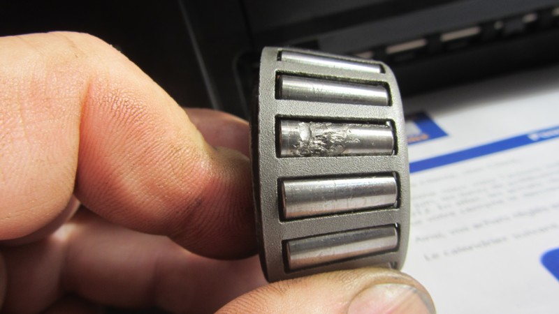 Comme la photo vous le montre un seul rouleau conique est niqué, rien sur les autres, défaut de traitement thermique ??? Par contre il était grand temps d'ouvrir, la bague fixe du roulement tournait sur l'arbre secondaire, 2 à 3/100 ème d'usure et surtout entamait le carter alu coté AR.