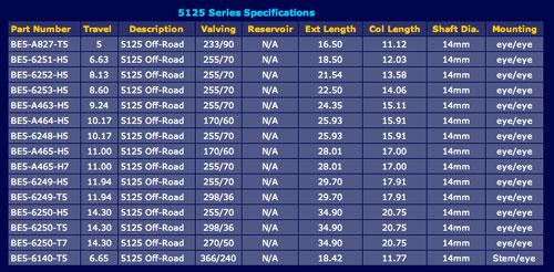 Ceux sont ceux de la Série 5125, 5150 et 7100 avec réservoir additionnel ou non et/ou séparé ou non..... à faire TARRER sur MESURE par Bilstein spécifiquement en fonction des caractéristiques du véhicule et de la Marque de celui-ci sur lequel ils seront utilisés, comme indiqué au début de l'inter....là bien sûr, on rentre plus dans la fourchette basse du très-haut-de gamme des amortisseurs dit «professionnel»....