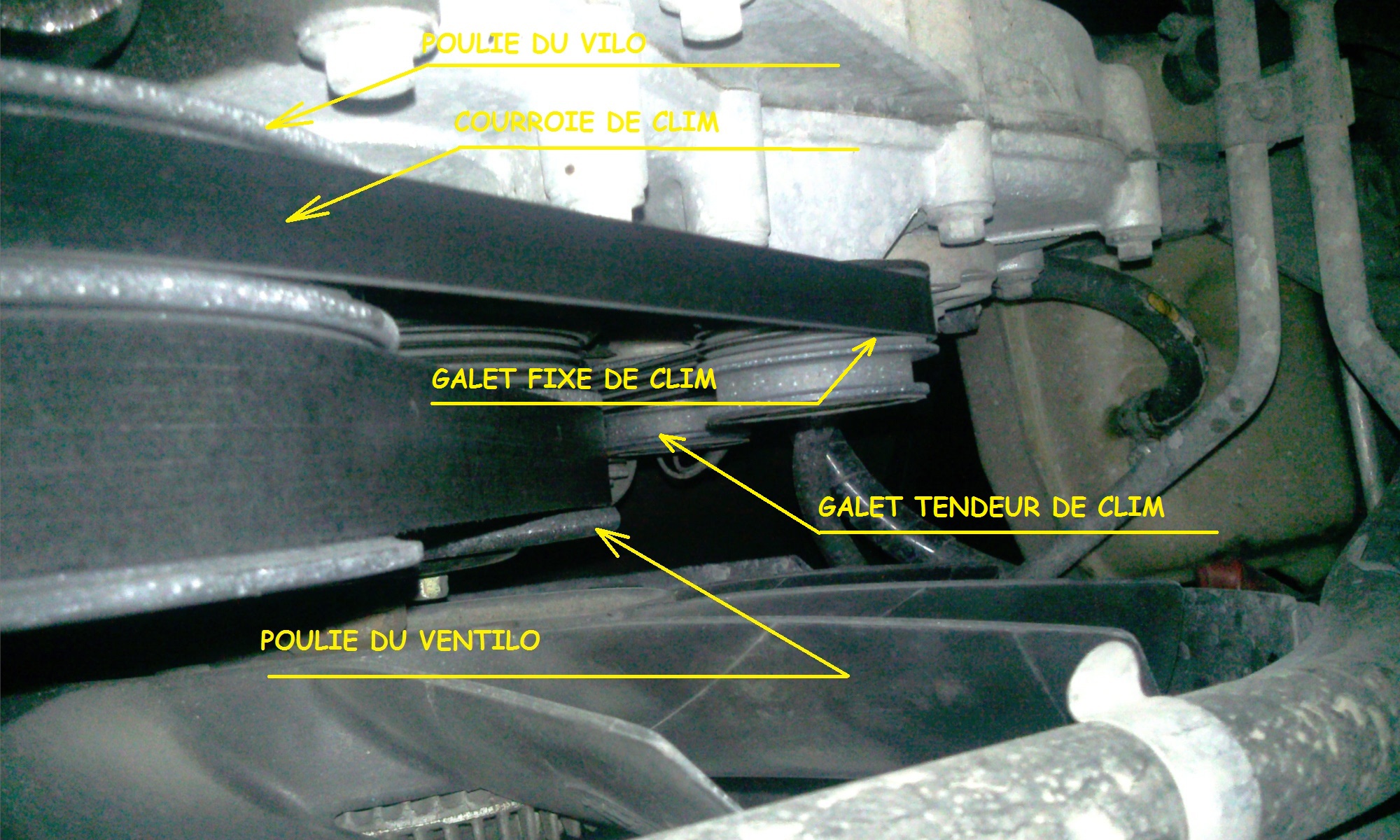 On remarquera que la courroie de clim est tangeante à la poulie du ventilateur alors qu'elle s'enroule autour de la poulie du vilo.