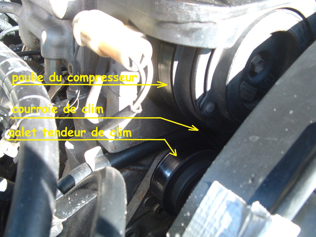 Eh oui, le compresseur de clim a sa petite courroie à lui qui est entrainée par la poulie de ventilateur... :mrgreen: