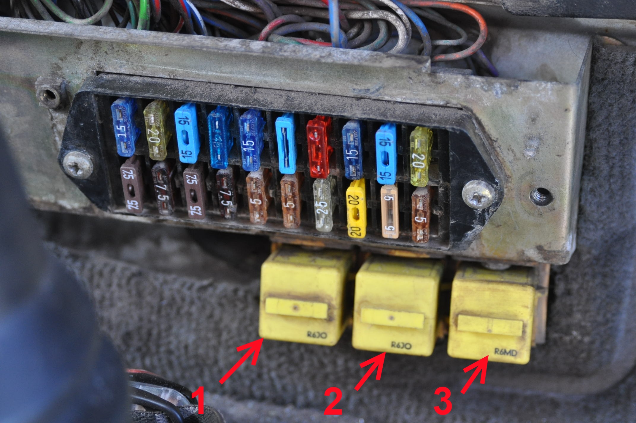 3 = relais de démarreur. Il y as deux pseudo relais derrière le tableau de fusible: 4 = centrale clignotante.