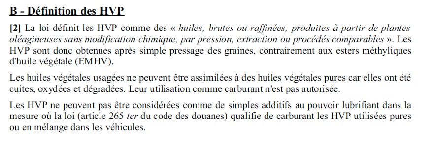 Je reviens juste sur ce point. Il apparaît en effet aujourd'hui que HVP est devenu l'abréviation rélementaire pour la dénomination réglementaire des huiles végétales pures, hors toute considération partisane.