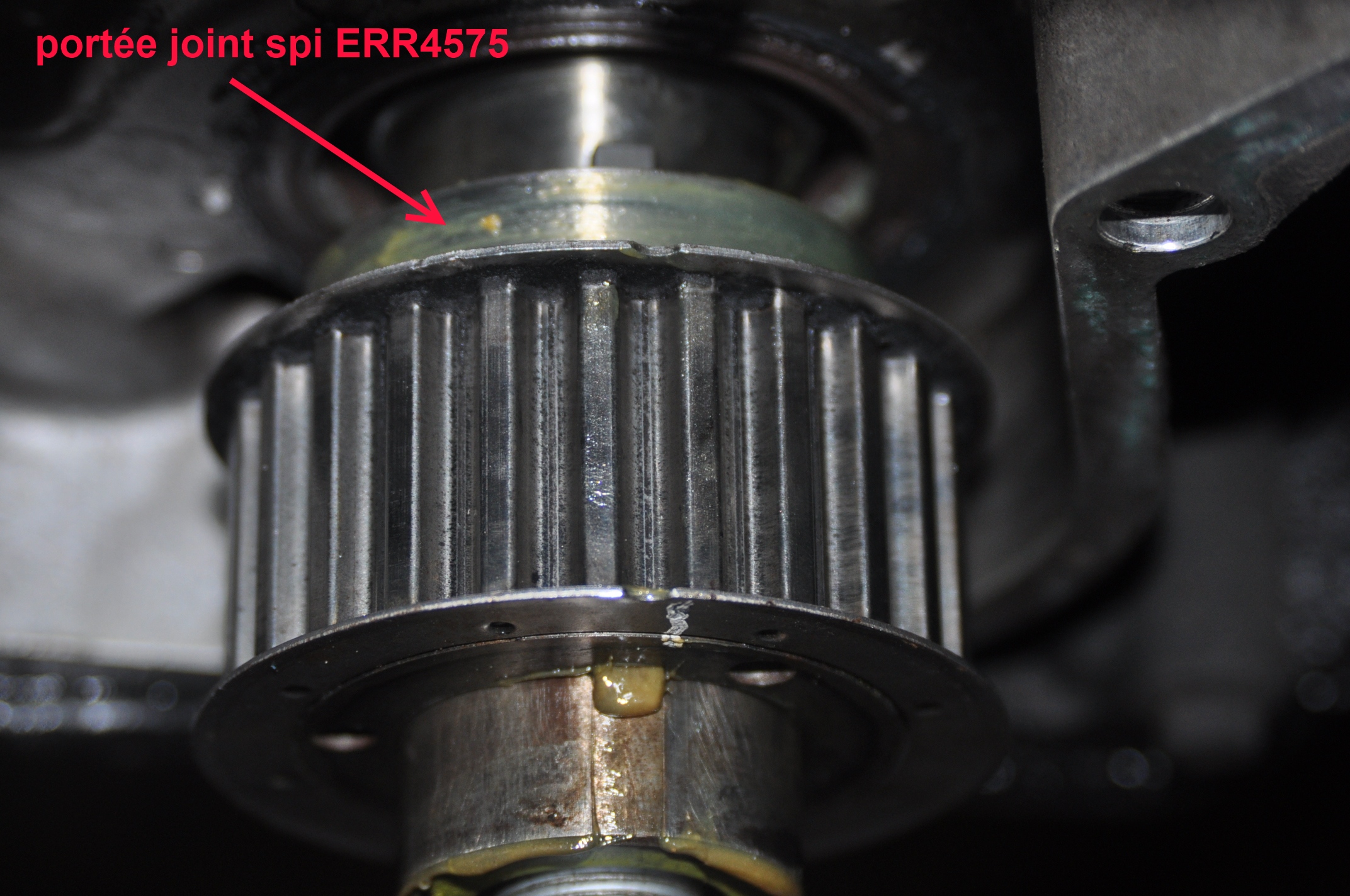Le logement du joint torique est derrière le pignon d'entrainement de la courroie en bout de vilebrequin. Comme tu peux le remarquer celui ci passe devant le logement des clavettes dans le pignon.