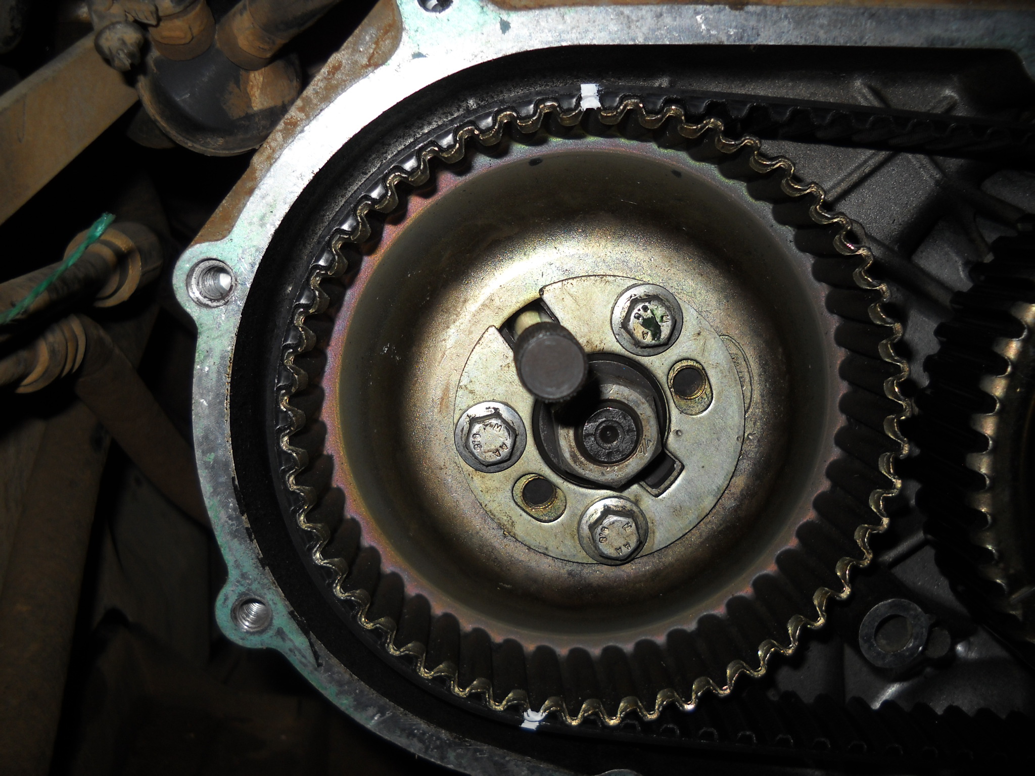 En situation avec une courroie en place. Dans ce cas entre les deux repères, il y a 20 dents de courroie. La poulie d'arbre à cames est bien calé, c'est l'angle de la photo qui trompe l’œil. :wink: On arrive a distinguer par rapport au trou oblong de rondelle de la poulie d'injection que celle ci est en butée droite. A votre avis si on desserre les 3 vis de la poulie d'injection et que l'on force sur celle ci vers la gauche aussi fort que l'on peut en tirant et en tendant la courroie si c'est moi, se sera moins tendu que feub mais bon, disons que je tiens la clef de 10 une fois tendu à mort vers la gauche donc je sers les vis. Puis on enlève la pige que va faire la poulie, elle va revenir légèrement en entrainant le moyeu, qu'est ce que tu crois, j'ai bien serré. Moralité, on sera légèrement décalé de combien ? Cela est dépendant de la force de l'ami feub, de l’élasticité de la courroie... Mais ce qui est sur c'est que l'on aura une avance . 1/16 de dent 1/4 ? 1/2 ? que dire.