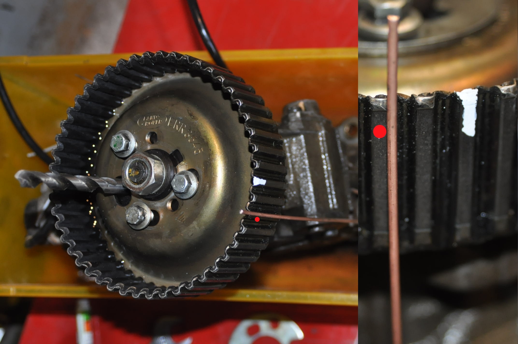 Poulie tournée en butée droite par rapport a ses trous oblongs de fixation. La dent blanche est en face de la baguette de soudure. Le point rouge repère la dent vers laquelle on va se déplacer.