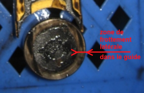 Que penses tu du galet dans son guide. Sur la photo ou l'ensemble est bien sale, on peut voir sur la surface de frottement latérale du galet dans son guide. Cela me rappelles les problèmes de guidage d'une pièce de monnaie dans un monnayeur. Le positionnement peut être influencée selon la dynamique. Il peut-être légèrement différent moteur tournant, ou moteur entrainé par une clef de 30 sur le vilebrequin. Dut a un phénomène de rebonds et de coincement lorsqu'on arrête le moteur avec la clef de contact par exemple que l'on a pas en tournant le vilebrequin à la poussette ou à la clef. Sachant que le poussoir bronze se déplace lui aussi dans le guide, ne peut-il peut y avoir un phénomène cumulatif ou circonstanciel qui provoquerait ce petit coincement ?