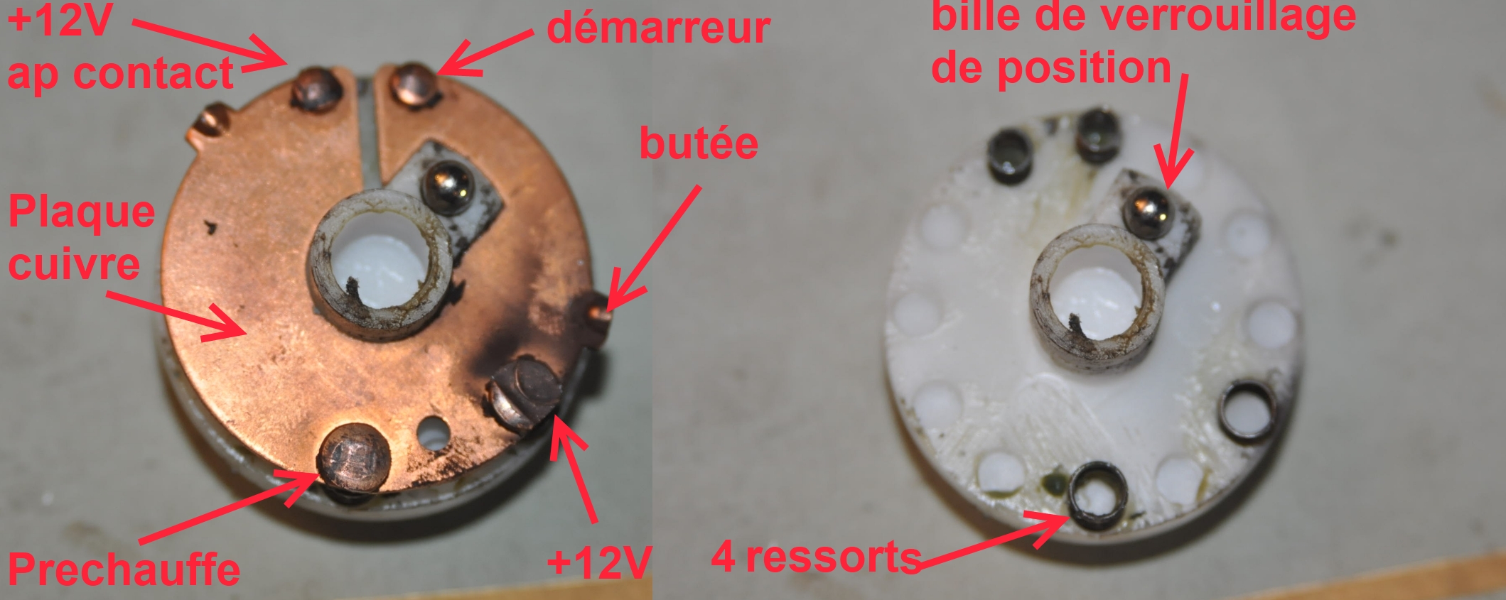 La raison de ton inversion est je pense l'ignorance, car effectivement à l’ohmmètre on peut voir un +12V s'établir dés que l'on tourne la clef en position 1, sur l'un ou l'autre des contacts, mais cela n'éclaire pas sur la puissance commutable, et le fait de leurs maintien, lorsque tu tournes la clef pour préchauffer ou démarrer.