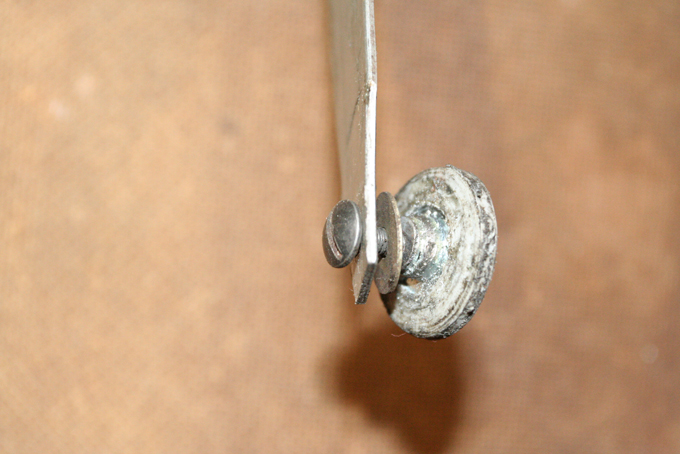 9-Fixez les nouvelles roulettes à l'aide d'une vis poëlier (tête de faible épaisseur) diamètre 4mm en intercalant une rondelle (diamètre intérieur 4 à 5mm) voir photo.