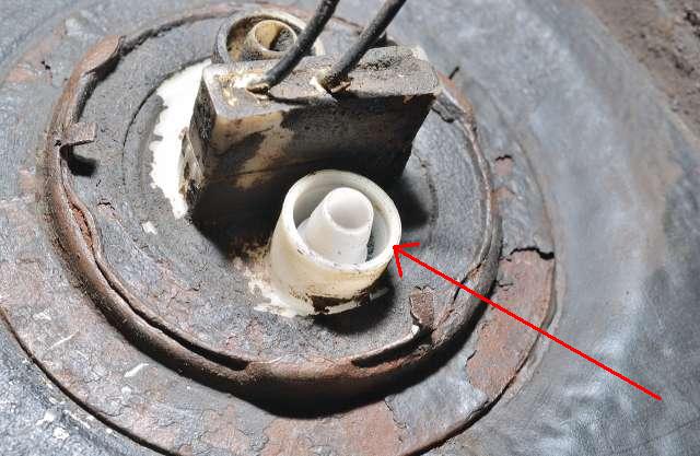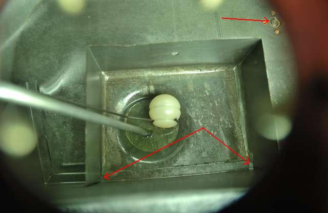 On voit clairement le cloisonnage qui fait office de reserve, le point de puisage de carburant, le flotteur de la jauge. Le tube en place est celui qui provient de la jauge. Les fleches jointes montrent 2 trous dans le cloisonnement, qui permettent au carburant de rentrer dans la reserve via les espèces "d'écopes" latérales (véhicule penchant vers l'arriere). Pour info, la conduite de retour aboutit exactement au meme endroit. On peut penser qu'elles sont donc interchangeables.
