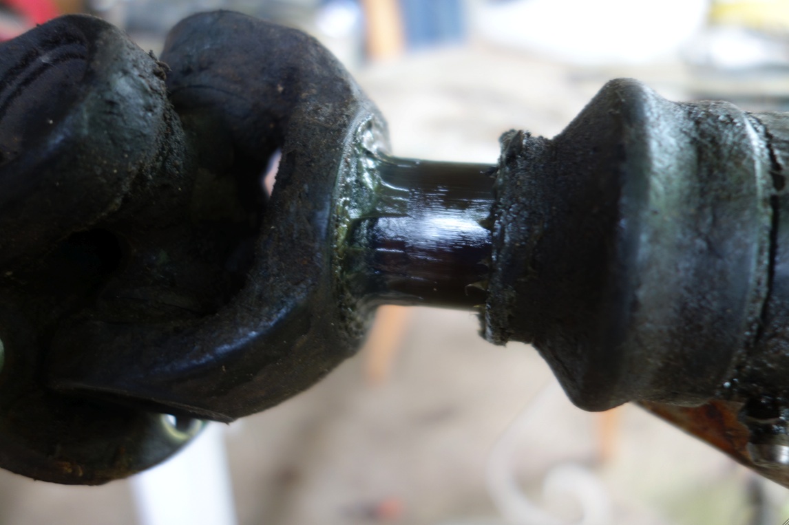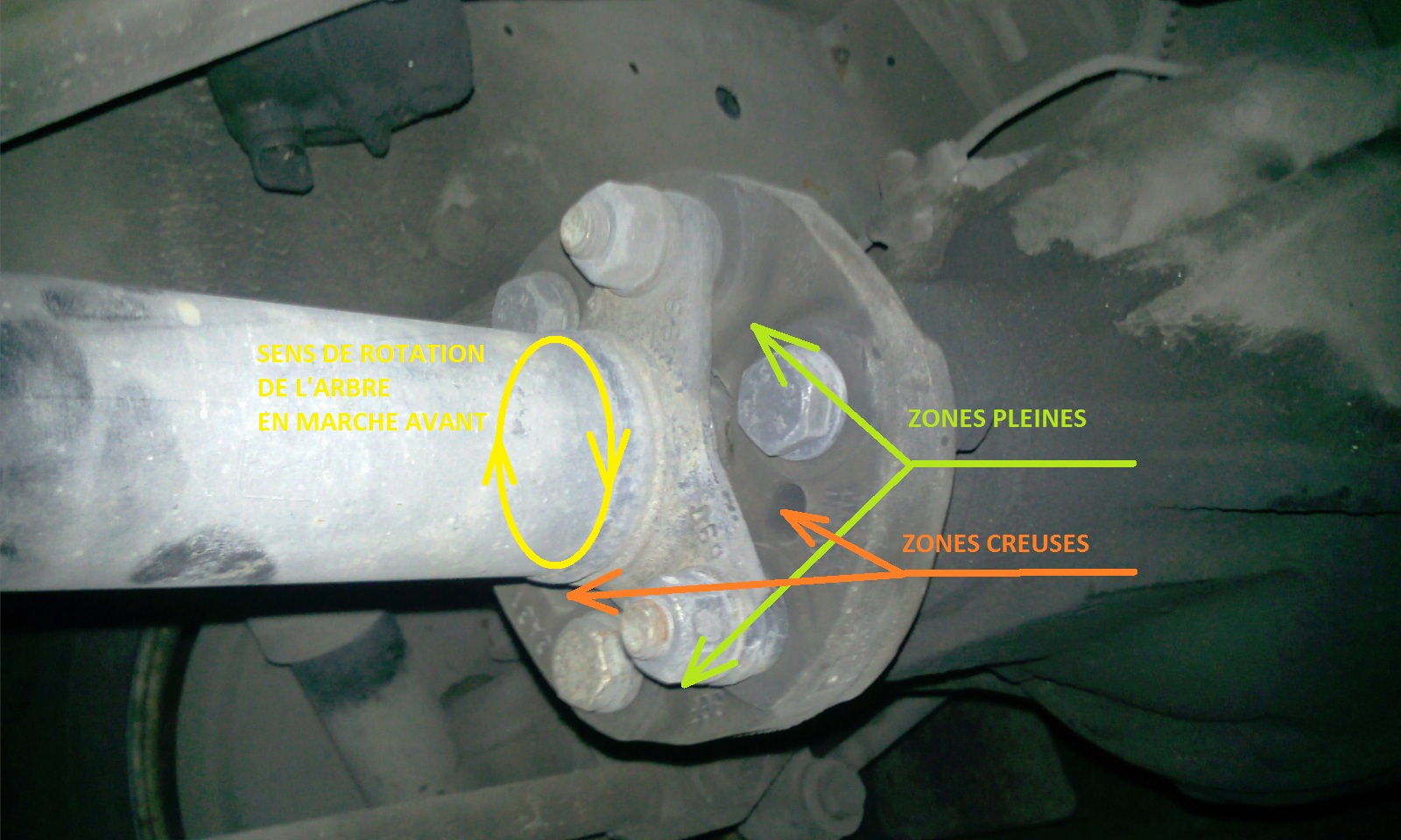 Pour démonter l"arbre AR dépose les 4 écrous du tambour, les 3 boulons qui fixent les "branches" de l'arbre au flector, comprime le coulisseau coté tambour pour dégager le cardan de ses 4 vis, abaisse l'arbre sous le tambour et tire le vers l'avant pour dégager l"autre bout de l"arbre de son roulement situé au milieu du flector.![]()