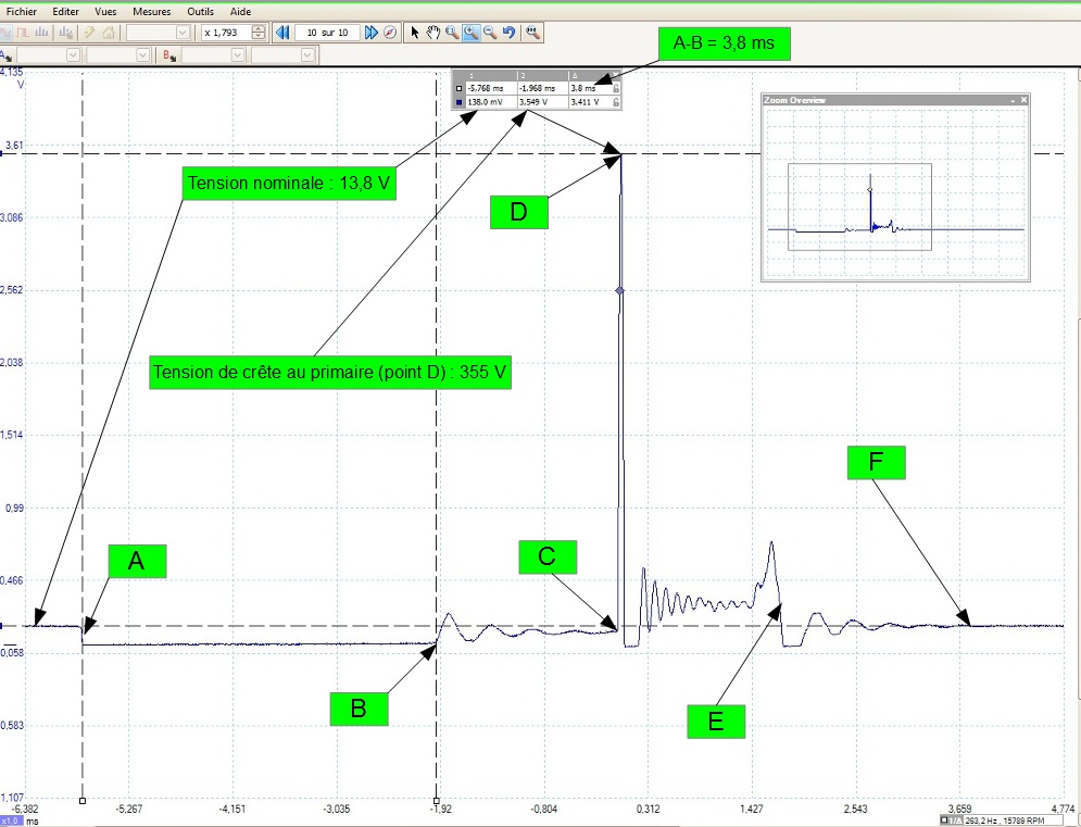 Avant le point A, le transistor est bloqué, il n'est pas conducteur, donc la bobine ne charge pas. On mesure par conséquent la différence de potentiel entre la sortie bobine et la masse, soit 13,8 V (tension générale au sein du circuit électrique).