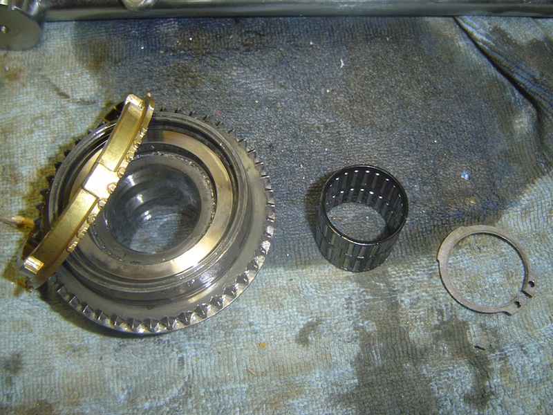 La dépose de ce pignon nous permet de sortir le pignon de 5° et sa douille à aiguilles ainsi que le synchro sur l'arbre de sortie. En dessous il y a un circlip qu'il faut retirer.