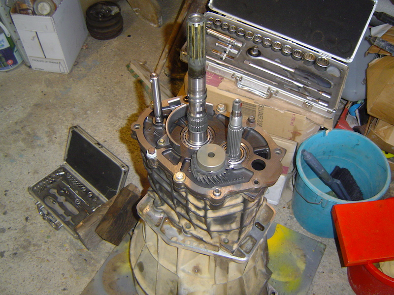 On attrape tout et on sort tout l'ensemble en même temps. L'arbre d'entrée peut venir avec, mais il est préférable de le sortir après car il ne reste collé à l'arbre de sortie que par la bague de synchro de 4° d'ou un risque de chute.